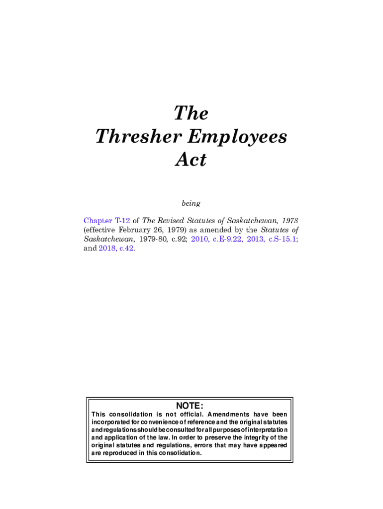 1 THRESHER Employees. T12The Thresher Employees Act being Chapter T12 of The Revised Statutes of Saskatchewan, 1978 (effective February 26, 1979) as amended by the Statutes of Saskatchewan, 197980,