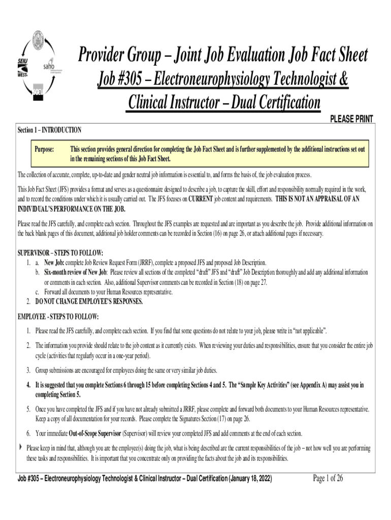 Provider Group Joint Job Evaluation Job Fact Sheet Job #305 Electroneurophysiology Technologist & Clinical Instructor Dual Certification PLEASE PRINT Section 1 INTRODUCTION Purpose:This section provides