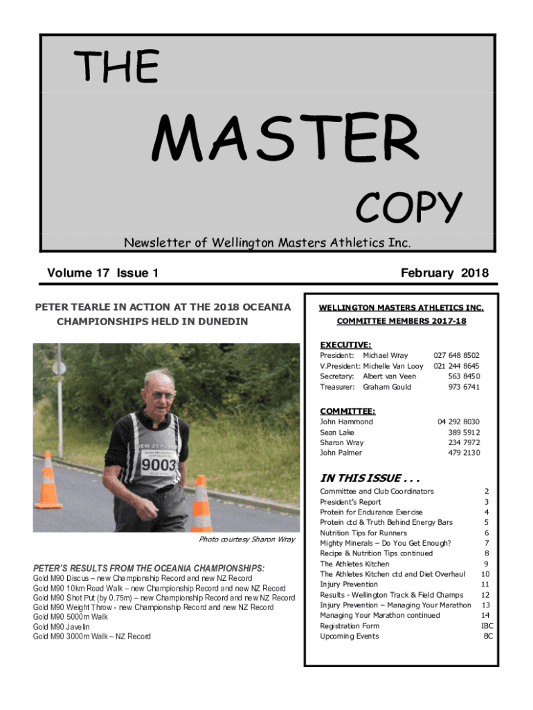 THEMASTERCOPYNewsletter of Wellington Masters Athletics Inc. Volume 17 Issue 1February 2018PETER EARLE IN ACTION AT THE 2018 OCEANIA CHAMPIONSHIPS HELD IN DUNEDINWELLINGTON MASTERS ATHLETICS INC.