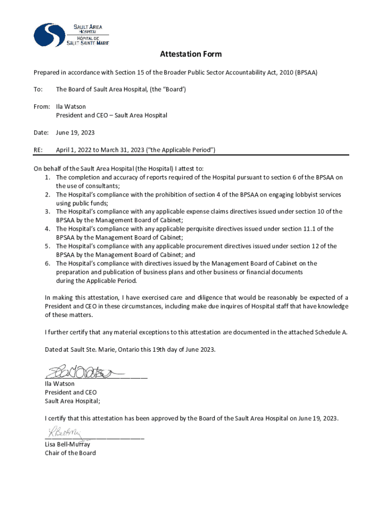 Attestation Form Prepared in accordance with Section 15 of the Broader Public Sector Accountability Act, 2010 (BP SAA) To:The Board of Salt Area Hospital, (the Board)From: Ila Watson President and