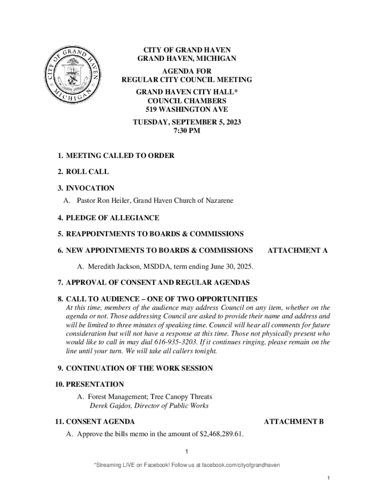 CITY OF GRAND HAVEN, MICHIGAN AGENDA FOR REGULAR CITY COUNCIL MEETING GRAND HAVEN CITY HALL* COUNCIL CHAMBERS 519 WASHINGTON AVE TUESDAY, SEPTEMBER 5, 2023 7:30 PM 1. MEETING CALLED TO ORDER 2. ROLL