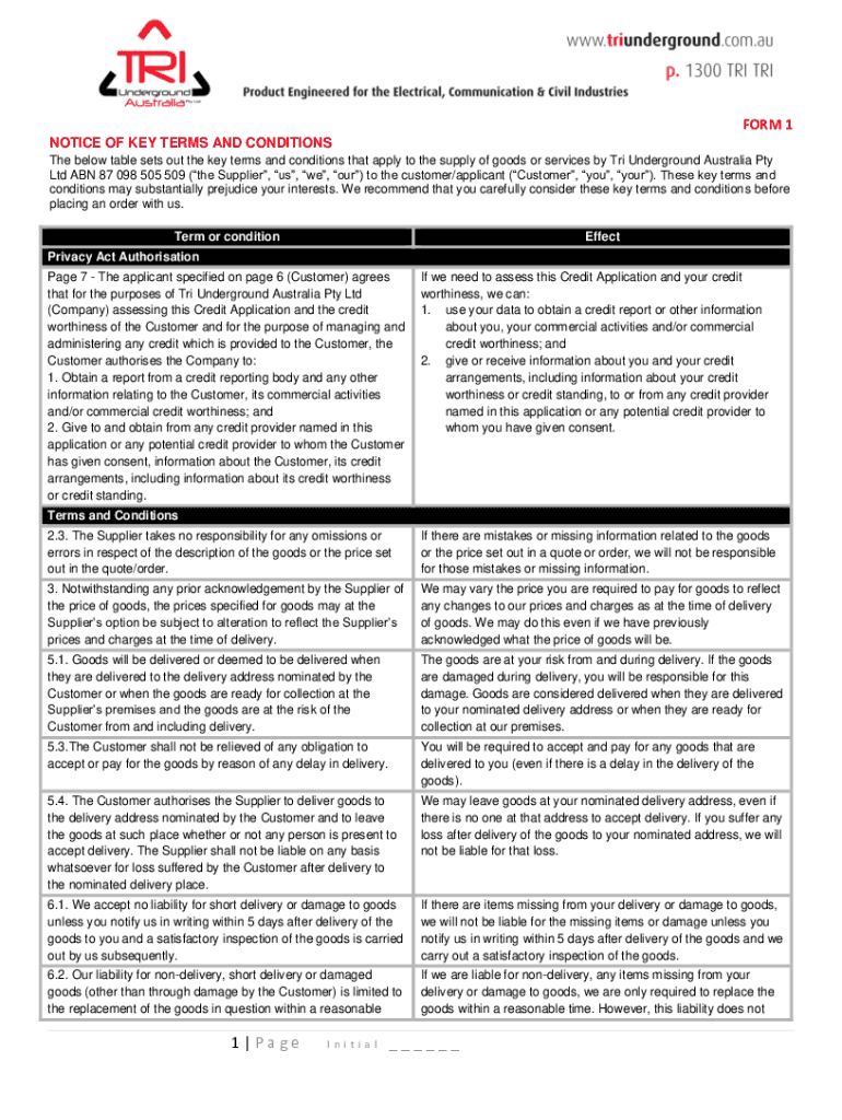FORM 1 NOTICE OF KEY TERMS AND CONDITIONS The below table sets out the key terms and conditions that apply to the supply of goods or services by TRI Underground Australia Pty Ltd ABN 87 098 505 509