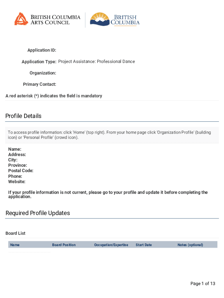 Application ID: Application Type: Project Assistance: Professional Dance Organization: Primary Contact: A red asterisk (*) indicates the field is mandatoryProfile Details To access profile information: