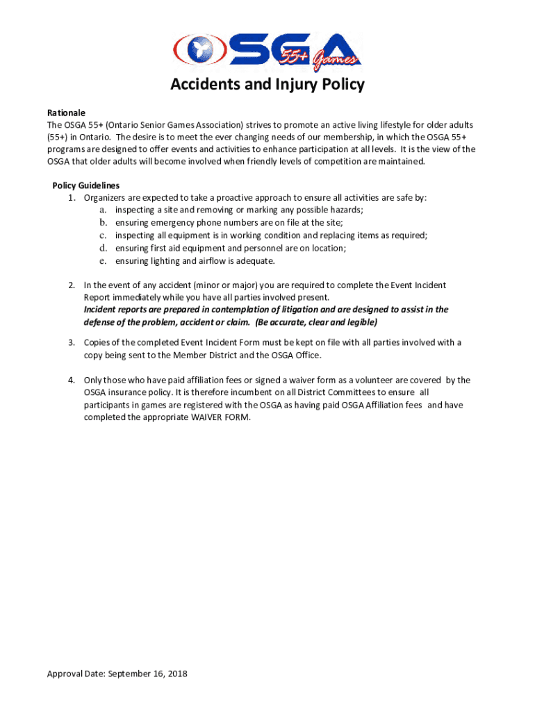 Accidents and Injury Policy Rationale The OLGA 55+ (Ontario Senior Games Association) strives to promote an active living lifestyle for older adults (55+) in Ontario. The desire is to meet the ever-changing