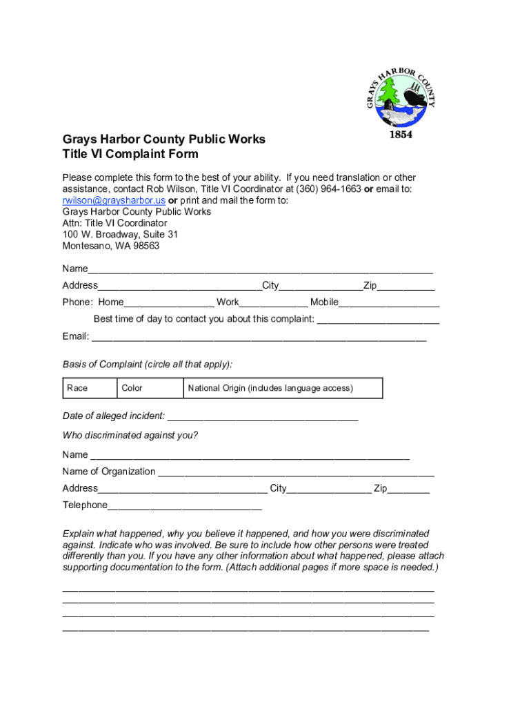 Grays Harbor County Public Works Title VI Complaint Form Please complete this form to the best of your ability. If you need translation or other assistance, contact Rob Wilson, Title VI Coordinator