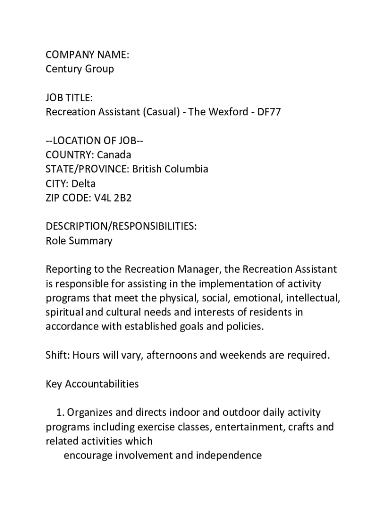 COMPANY NAME: Century Group JOB TITLE: Recreation Assistant (Casual) The Oxford DF77 LOCATION OF COUNTRY: Canada STATE/PROVINCE: British Columbia CITY: Delta ZIP CODE: V4L 2B2 DESCRIPTION/RESPONSIBILITIES: