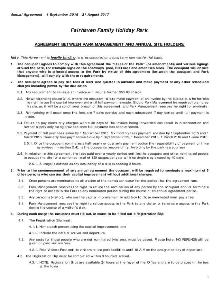 Annual Agreement 1 September 2016 31 August 2017Fairhaven Family Holiday Park. AGREEMENT BETWEEN PARK MANAGEMENT AND ANNUAL SITE HOLDERS. Note: This Agreement is legally binding to sites occupied