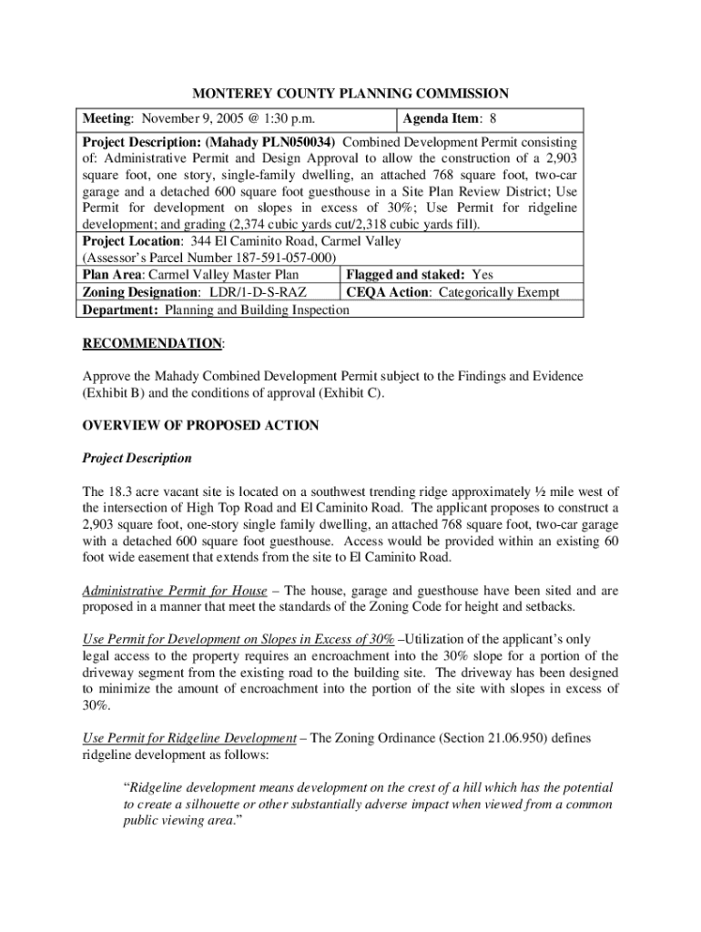 MONTEREY COUNTY PLANNING COMMISSION Meeting: November 9, 2005 @ 1:30 p.m. Agenda Item: 8Project Description: (Malady PLN050034) Combined Development Permit consisting of: Administrative Permit and