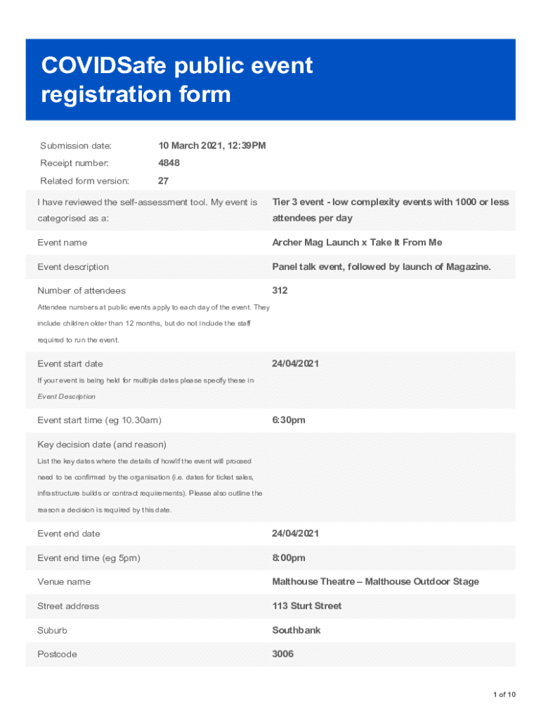 COVIDSafe public event registration form Submission date:10 March 2021, 12:39PMReceipt number:4848Related form version:27I have reviewed the self assessment tool. My event mistier 3 event low complexity