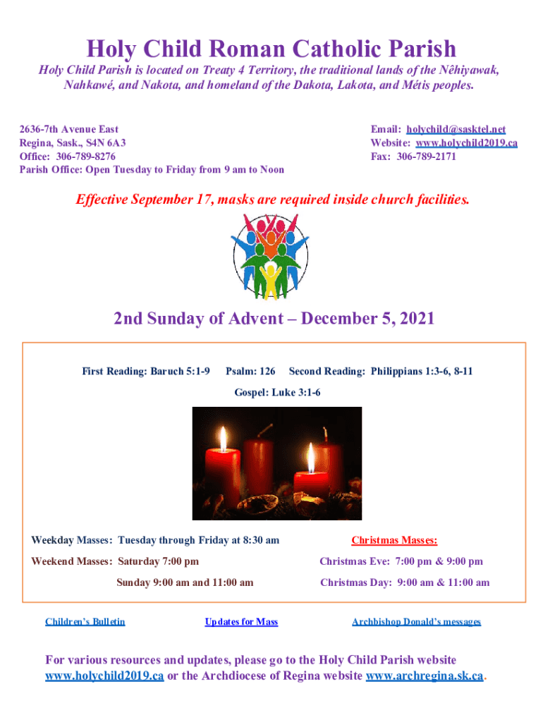 Holy Child Roman Catholic Garishly Child Parish is located on Treaty 4 Territory, the traditional lands of the Nhiyawak, Ahead, and Dakota, and homeland of the Dakota, Lakota, and Otis peoples. 26367th