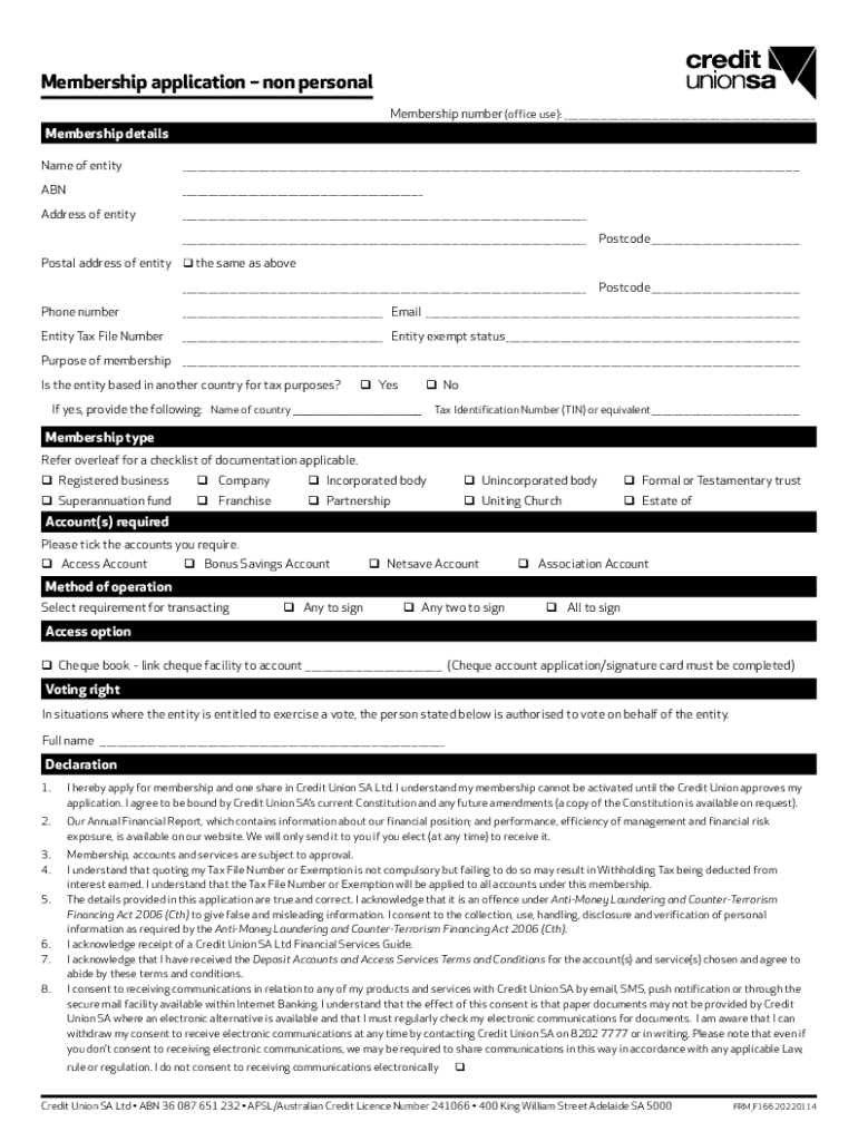 Membership application non-personal Membership number (office use):___Membership details Name of entity___ABN___Address of entity______Postcode___Postal address of entity the same as above___Postcode___Phone
