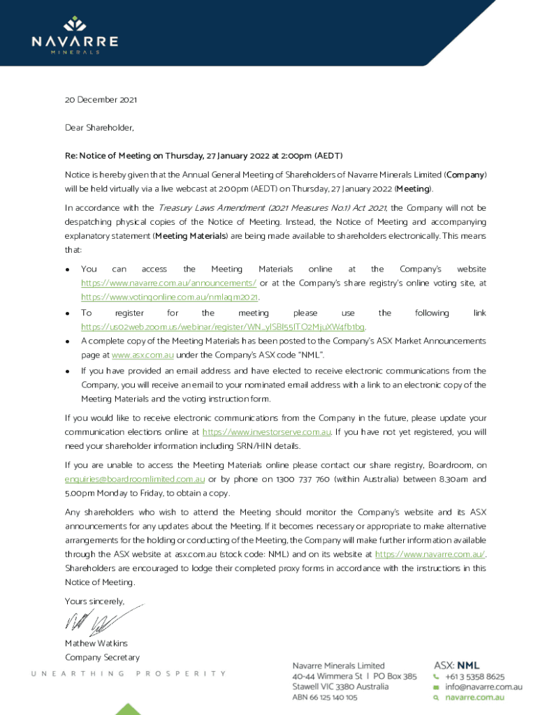 20 December 2021 Dear Shareholder, Re: Notice of Meeting on Thursday, 27 January 2022 at 2:00pm (ADT) Notice is hereby given that the Annual General Meeting of Shareholders of Navarre Minerals Limited