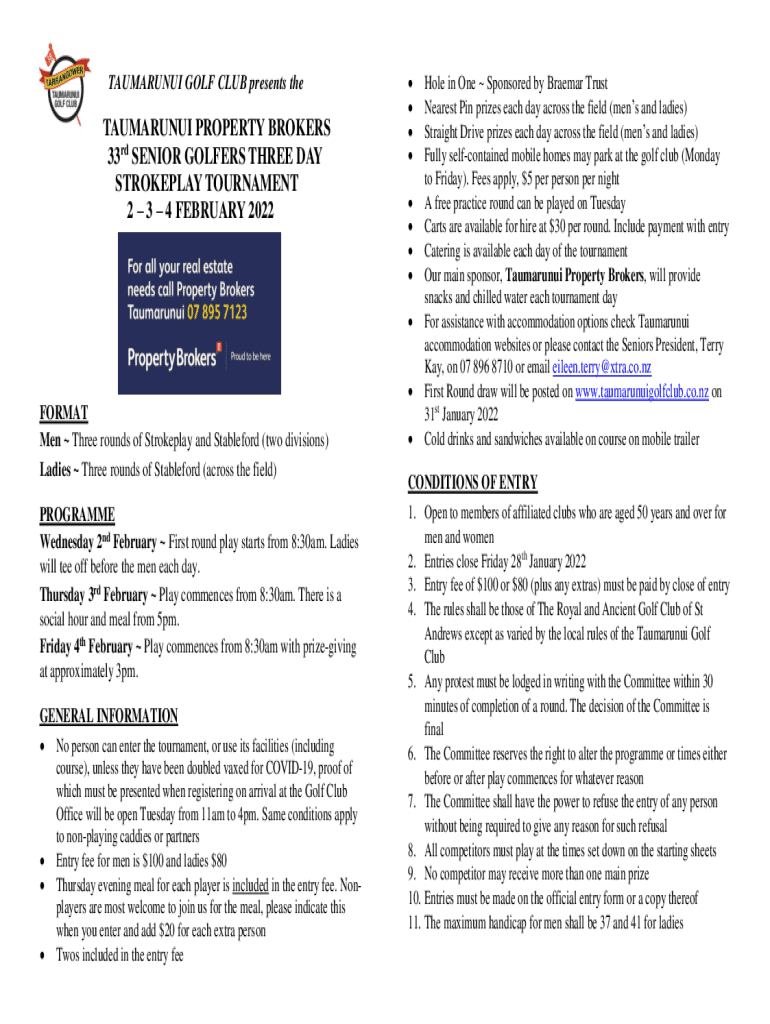 TAUMARUNUI GOLF CLUB presents theTAUMARUNUI PROPERTY BROKERS 33rd SENIOR GOLFERS THREE DAY STROKEPLAY TOURNAMENT 2 3 4 FEBRUARY 2022 FORMAT Men Three rounds of Stroke play and Stable ford (two divisions)