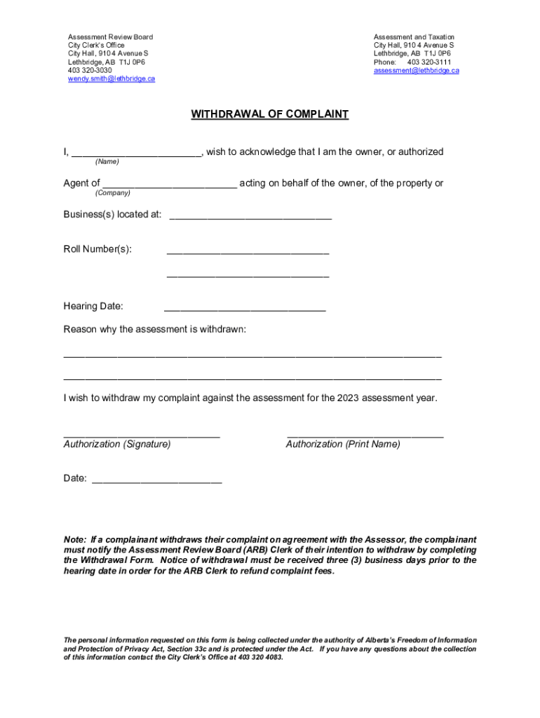 Assessment Review Board City Clerks Office City Hall, 910 4 Avenue S Lethbridge, AB T1J 0P6 403 3203030 wendy.smith@lethbridge.caAssessment and Taxation City Hall, 910 4 Avenue S Lethbridge, AB T1J
