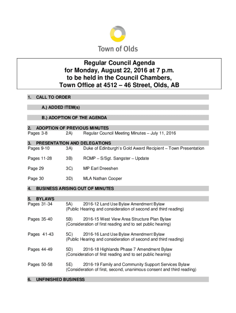 Regular Council Agenda for Monday, August 22, 2016, at 7 p.m. to be held in the Council Chambers, Town Office at 4512 46 Street, Olds, AB 1.CALL TO ORDER A.) ADDED ITEM(s) B.) ADOPTION OF THE AGENDA2.