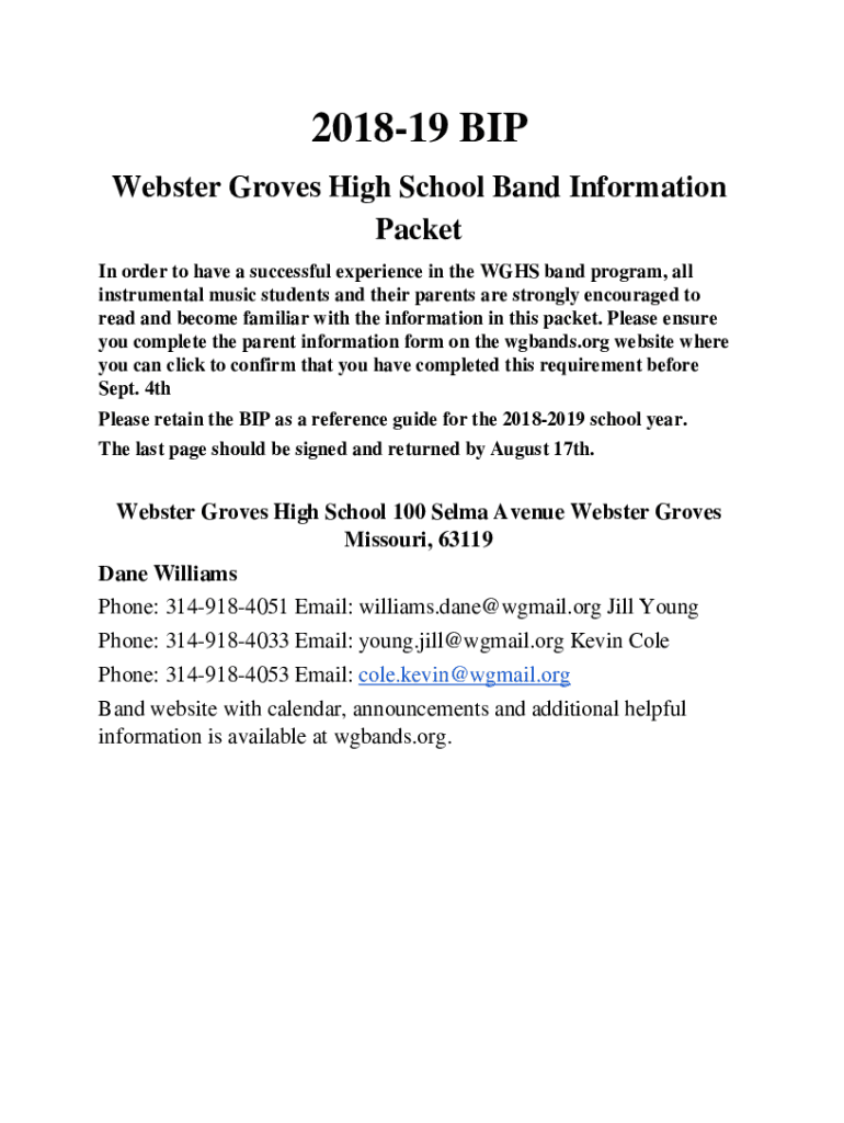 201819 BIG Webster Groves High School Band Information Packet In order to have a successful experience in the GHS band program, all instrumental music students and their parents are strongly encouraged