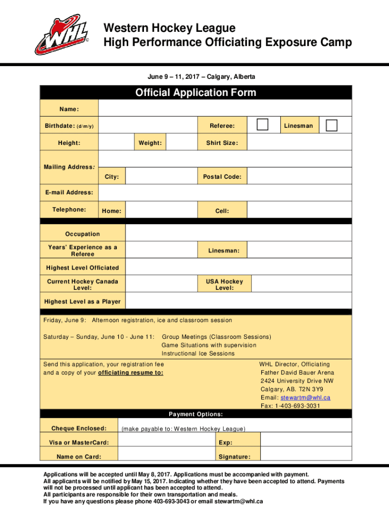 WESTERN HOCKEY LEAGUE HIGH PERFORMANCE OFFICIATING EXPOSURE CAMP JUNE 9 11, 2017 FATHER DAVID BAUER ARENA, CALGARY, ALBERTA The Western Hockey League is hosting a High Performance Officiating Exposure