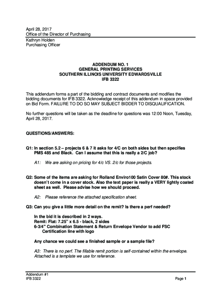 April 28, 2017, Office of the Director of Purchasing Kathryn Holden Purchasing OfficerADDENDUM NO. 1 GENERAL PRINTING SERVICES SOUTHERN ILLINOIS UNIVERSITY EDWARDSVILLE IF 3322This addendum forms