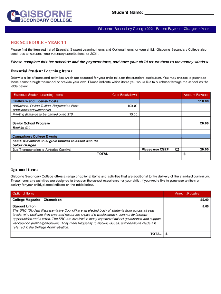 Student Name: ___Gisborne Secondary College 2021 Parent Payment Charges Year 11FEE SCHEDULE YEAR 11