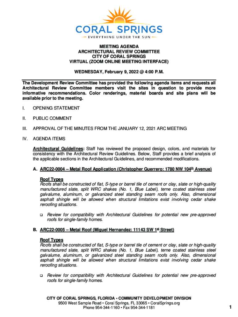 MEETING AGENDA ARCHITECTURAL REVIEW COMMITTEE CITY OF CORAL SPRINGS VIRTUAL (ZOOM ONLINE MEETING INTERFACE) WEDNESDAY, February 9, 2022 @ 4:00 P.M. The Development Review Committee has provided the