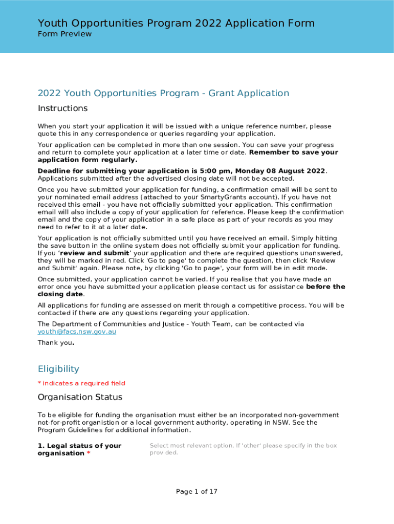 Youth Opportunities Program 2022 Application Form Preview2022 Youth Opportunities Program Grant Application Instructions When you start your application it will be issued with a unique reference number,