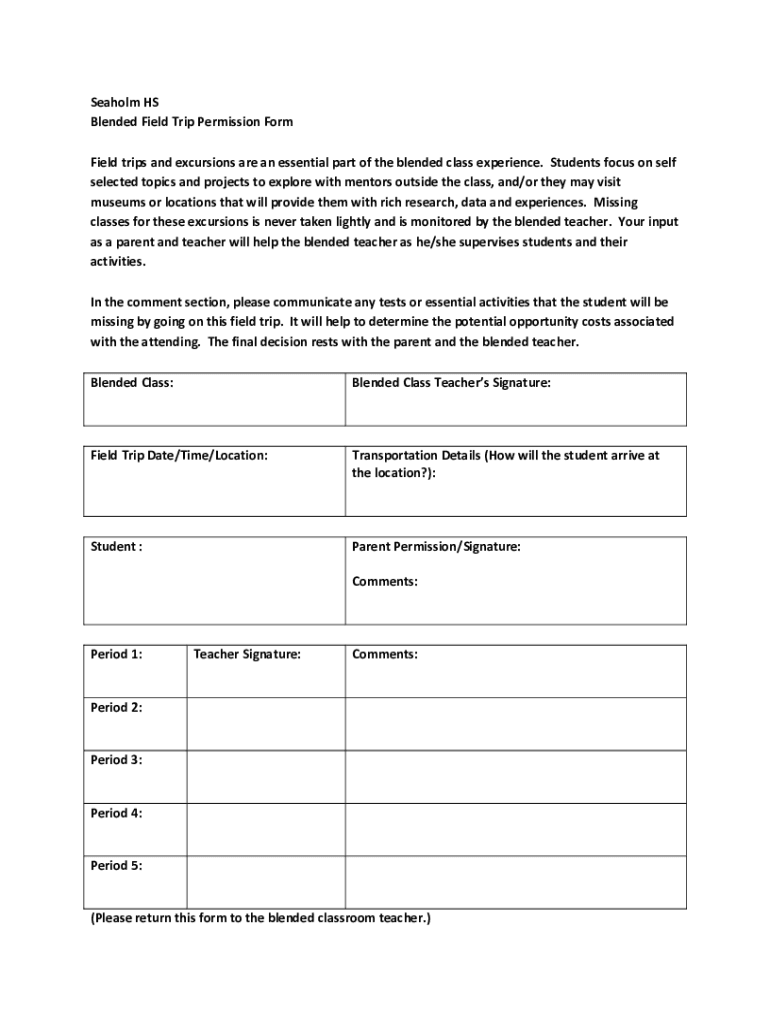 Season HS Blended Field Trip Permission Form Field trips and excursions are an essential part of the blended class experience. Students focus on self selected topics and projects to explore with mentors