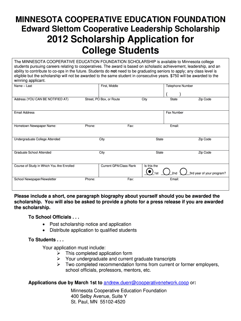MINNESOTA COOPERATIVE EDUCATION FOUNDATION Edward Letter Cooperative Leadership Scholarship 2012 Scholarship Application for College Students The MINNESOTA COOPERATIVE EDUCATION FOUNDATION SCHOLARSHIP