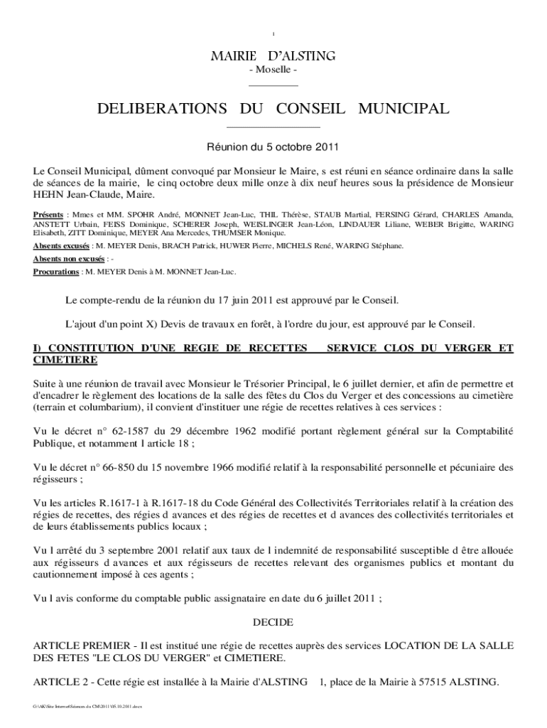 1MAIRIE DATING Moselle ___DELIBERATIONS DU CONSENT MUNICIPAL ___ Union Du 5 October 2011 Le Conrail Municipal, dent convoy par Monsieur LE Maine, set run en since ordinary days' la sale DE dances