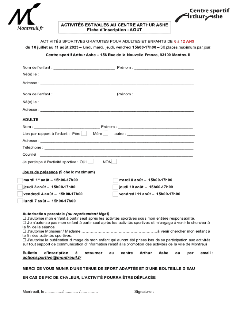 ACTIVITY ESTIMATES AU Center ARTHUR ASHE Fiche d\'inscription ABOUT ACTIVITY SPORTIVE GRATUITIES POUR ADULTS ET INFANTS DE 6 12 ANS Du 10 bullet AU 11 AOT 2023 Lundy, Mari, Jedi, vended 15h0017h00