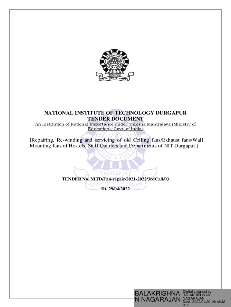 NATIONAL INSTITUTE OF TECHNOLOGY DURGAPUR TENDER DOCUMENT An Institution of National Importance under Shikhar Mandalay (Ministry of Education), Govt. of India.[Repairing, Rewinding and servicing of
