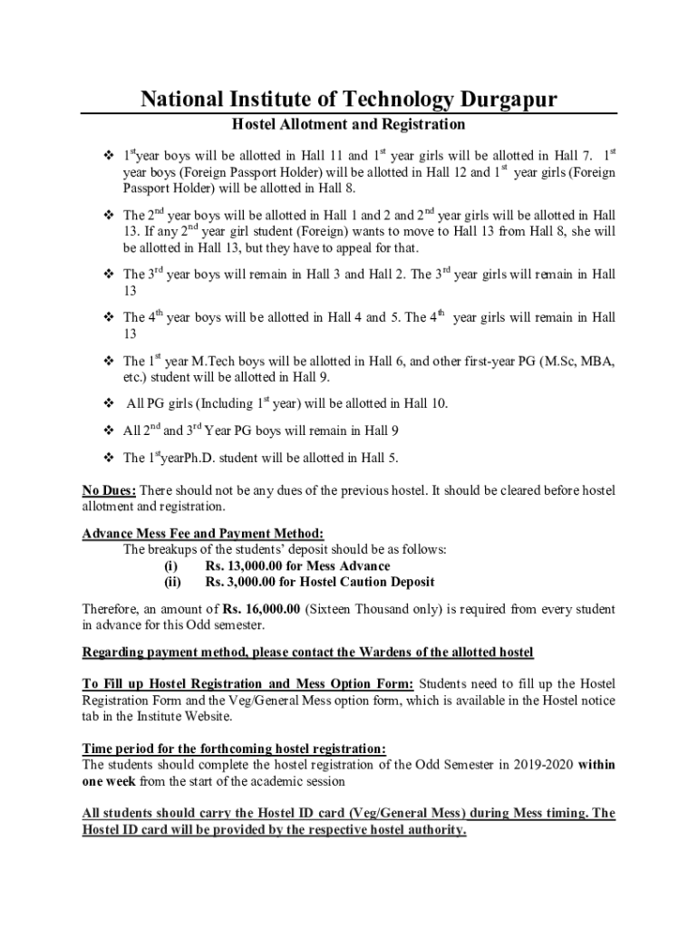 National Institute of Technology Durgapur Hostel Allotment and Registration 1styear boys will be allotted in Hall 11 and 1st year girls will be allotted in Hall 7. 1st year boys (Foreign Passport