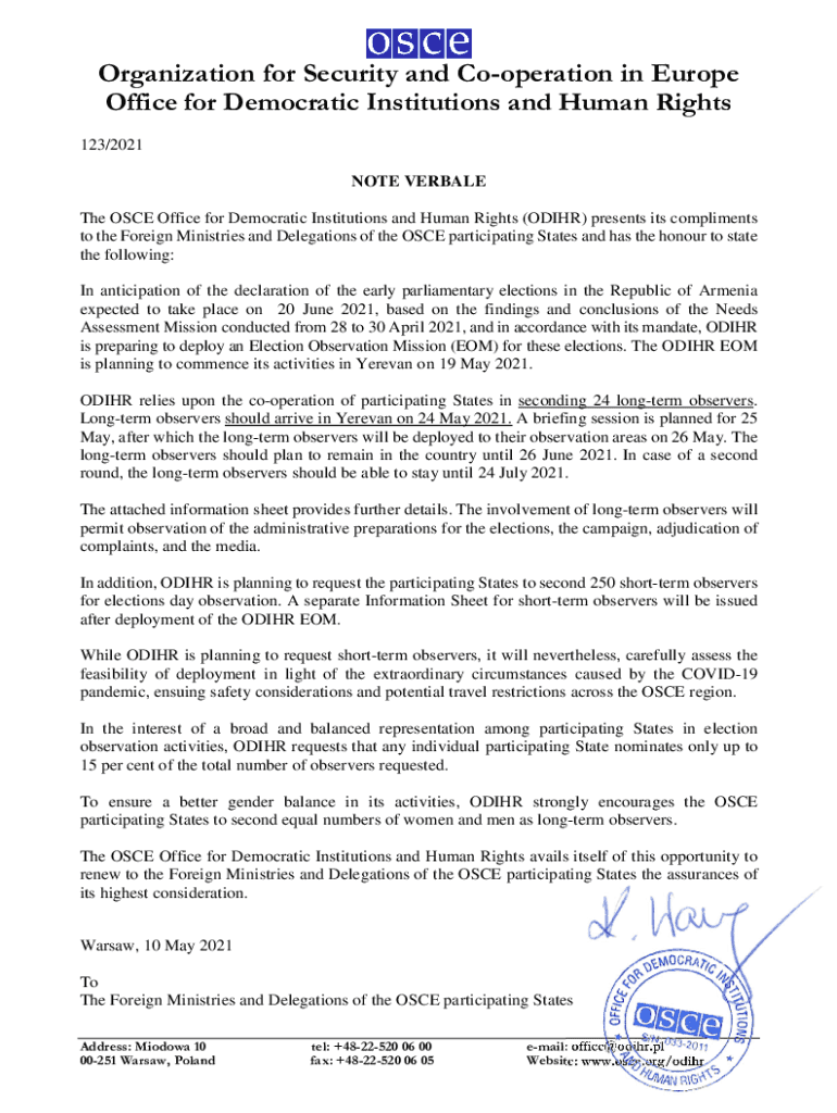 Organization for Security and Cooperation in Europe Office for Democratic Institutions and Human Rights 123/2021 NOTE VERBAL The OSCE Office for Democratic Institutions and Human Rights (ODI HR) presents