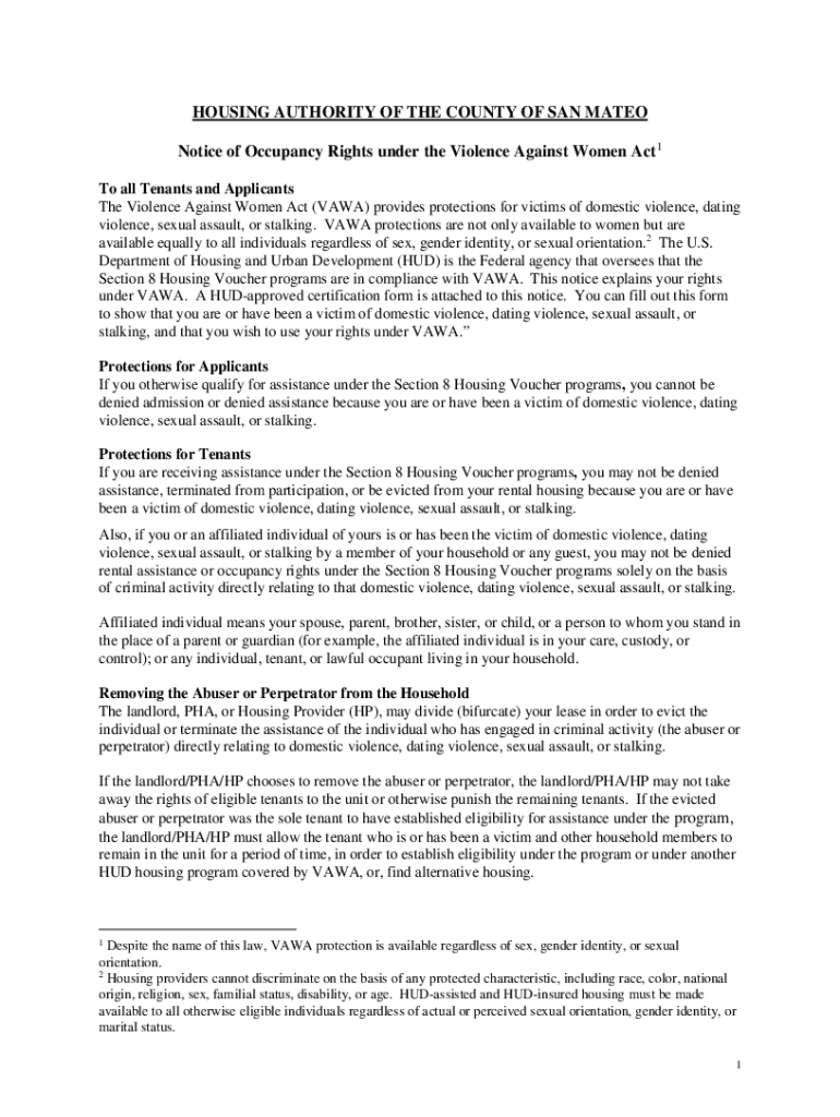HOUSING AUTHORITY OF THE COUNTY OF SAN MATEO Notice of Occupancy Rights under the Violence Against Women Act 1 To all Tenants and Applicants The Violence Against Women Act (AWA) provides protections