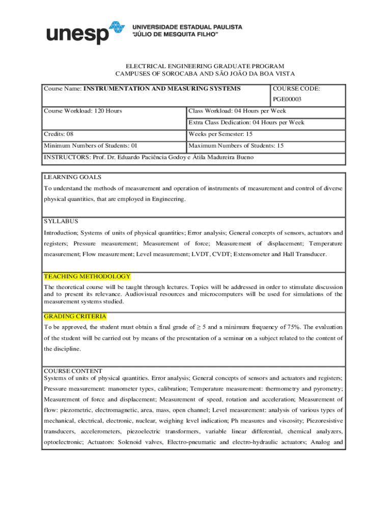 ELECTRICAL ENGINEERING GRADUATE PROGRAM CAMPUSES OF SOROCABA AND SO TOO DA BOA VISTA Course Name: INSTRUMENTATION AND MEASURING SYSTEMSCOURSE CODE: PGE00003Course Workload: 120 Hourglass Workload: