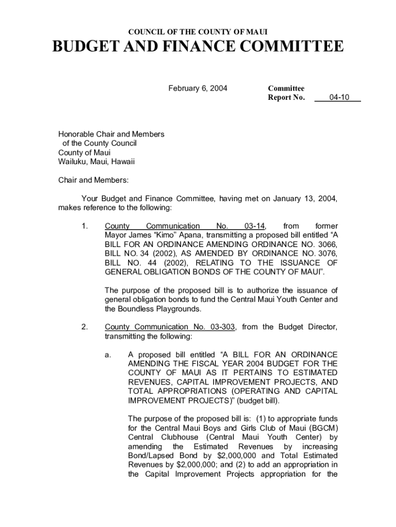 COUNCIL OF THE COUNTY OF MAUIBUDGET AND FINANCE COMMITTEE February 6, 2004Committee Report No.0410Honorable Chair and Members of the County Council County of Maui Wailuku, Maui, Hawaii Chair and Members: