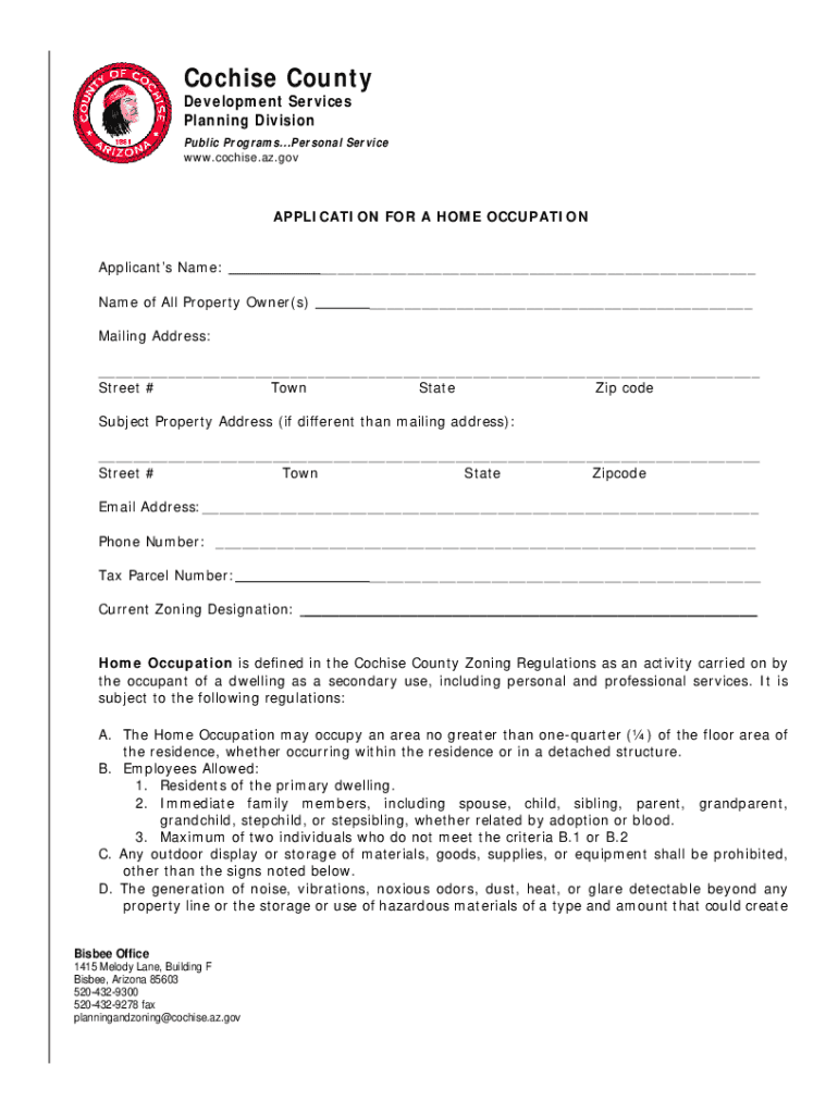 Get the free Home Occupation Application (PDF) - Cochise County - az.gov