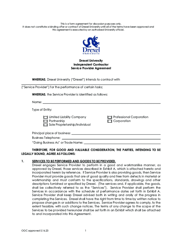 This is a form agreement for discussion purposes only. It does not constitute a binding offer or contract of Drexel University until all the terms have been approved and this agreement is executed