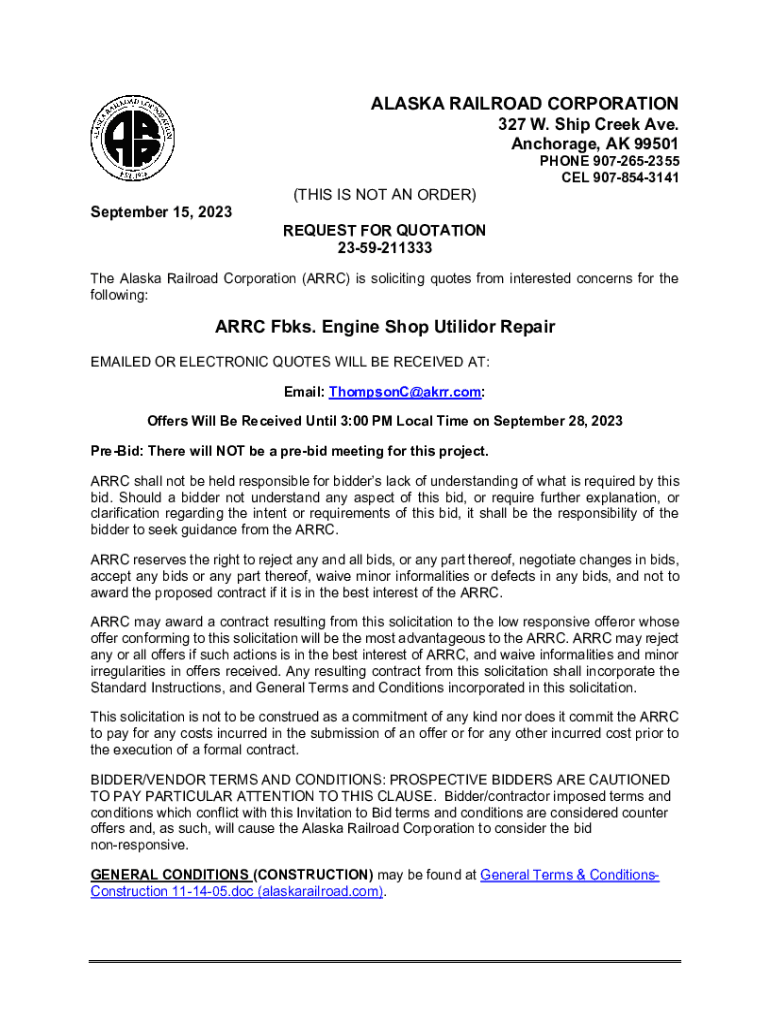 ALASKA RAILROAD CORPORATION 327 W. Ship Creek Ave. Anchorage, AK 99501 PHONE 9072652355 CEL 9078543141(THIS IS NOT AN ORDER) September 15, 2023, REQUEST FOR QUOTATION 2359211333 The Alaska Railroad