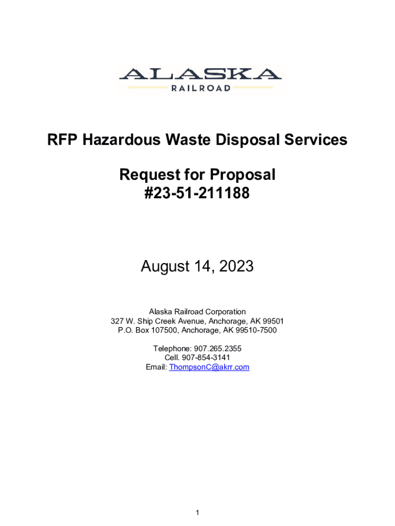 RFP Hazardous Waste Disposal Services Request for Proposal #2351211188August 14, 2023 Alaska Railroad Corporation 327 W. Ship Creek Avenue, Anchorage, AK 99501 P.O. Box 107500, Anchorage, AK 995107500