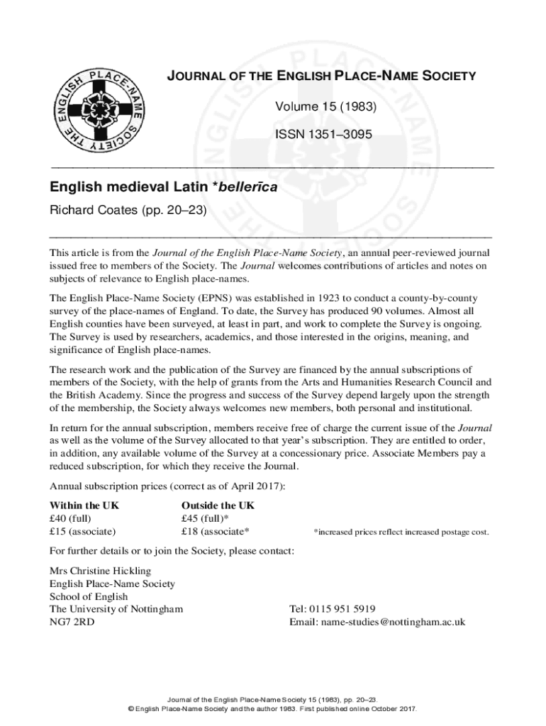 JOURNAL OF THE ENGLISH PLACE-NAME SOCIETY Volume 15 (1983) ISSN 13513095 ___English medieval Latin *Billerica Richard Coates (pp. 2023) ___ This article is from the Journal of the English Place-name