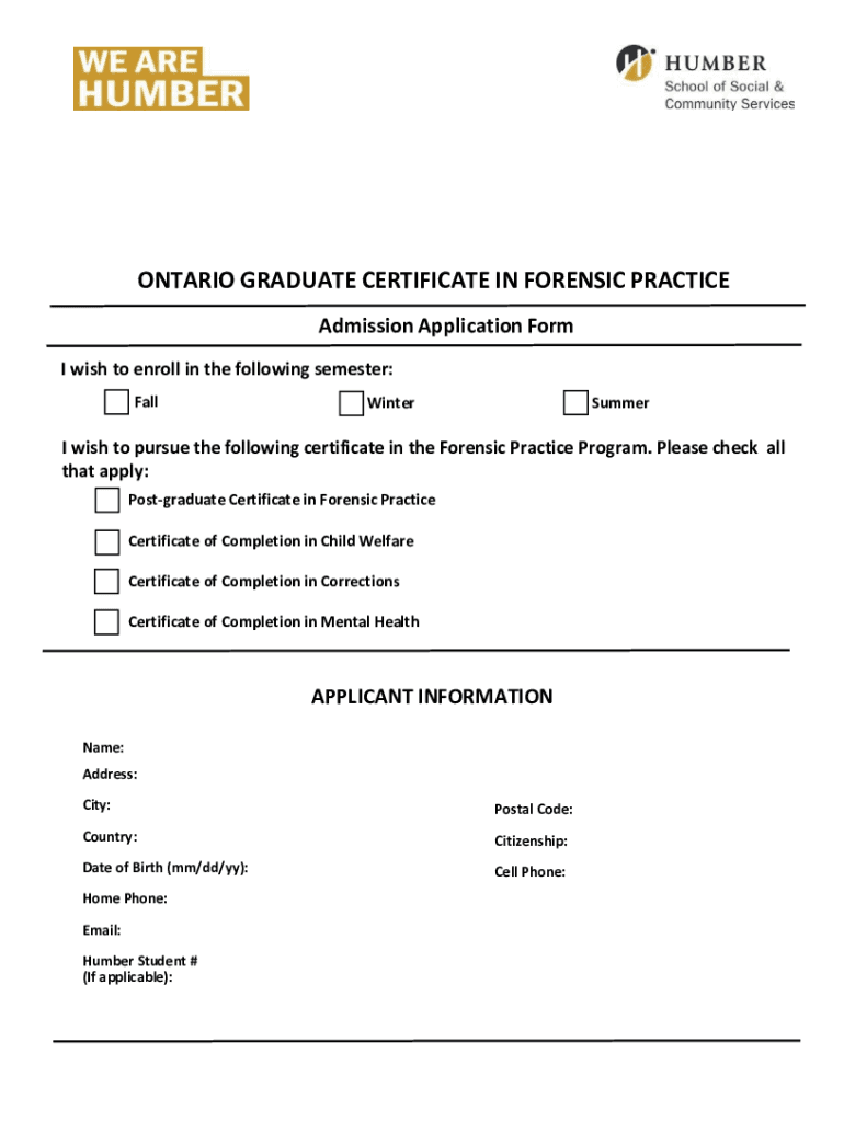 ONTARIO GRADUATE CERTIFICATE IN FORENSIC PRACTICE Admission Application Form I wish to enroll in the following semester: FallWinterSummerI wish to pursue the following certificate in the Forensic