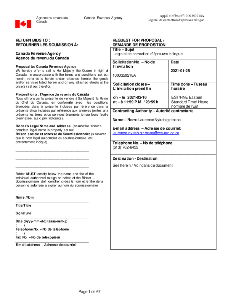Agency Du revenue Du Canada Revenue AgencyRETURN BIDS TO : RETURNER LES COMMISSION :Appeal doff res n o 1000350218A Logical DE correction drives bilingueREQUEST FOR PROPOSAL / DEMAND DE PROPOSITION