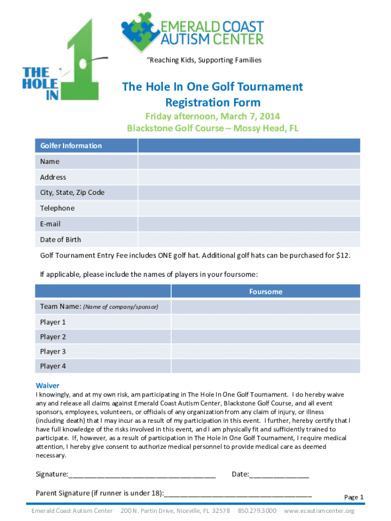 Reaching Kids, Supporting Families Hole In One Golf Tournament Registration Form Friday afternoon, March 7, 2014, Blackstone Golf Course Mossy Head, FL Golfer Informational Address City, State, Zip