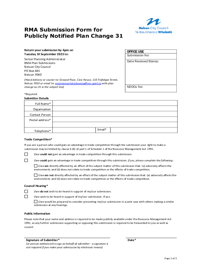 RMA Submission Form for Publicly Notified Plan Change 31 Return your submission by 4pm on Tuesday 19 September 2023 to:OFFICE USE Submission No:Senior Planning Administrator RMA Plan Submissions Nelson