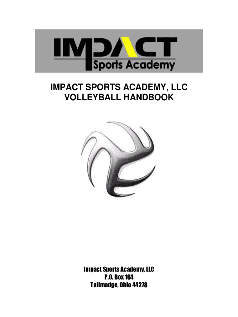 IMPACT SPORTS ACADEMY, LLC VOLLEYBALL HANDBOOKImpact Sports Academy, LLC P.O. Box 164 Talmadge, Ohio 44278Introduction Impact Sports Academy, LLC (Impact) offers a competitive volleyball program for