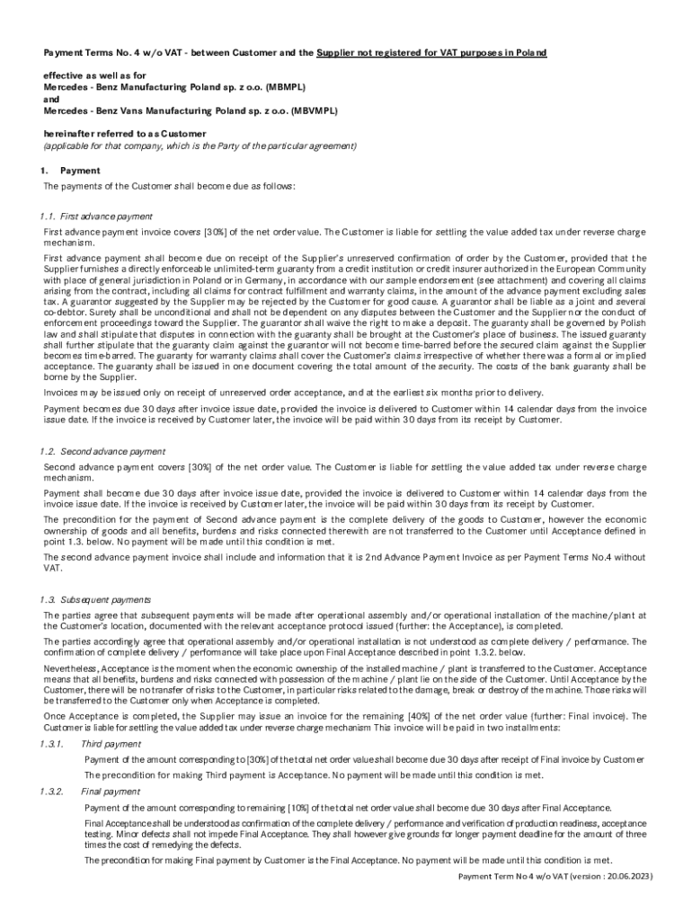 Payment Terms No. 4 w/o VAT between Customer and the Supplier not registered for VAT purposes in Poland effective as well as for Mercedes-Benz Manufacturing Poland SP. z o.o. (MB MPL) and Mercedes-Benz