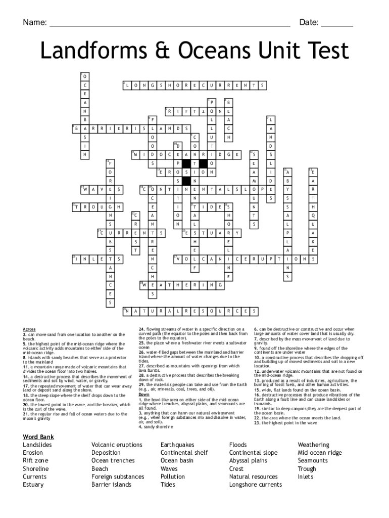 Name: ___ Date: ___Landforms & Oceans Unit Test 1O 2CLONGSHORECURRENTSE 3A 5 N 6B 8BARRIERISLSOIO 11NMIRID13FANDAVEDOCEROEROUG18CTH 23NCS 24CUR RRBINLETONTICTEIAON NSS 26E19TTNCUHNOTNRIOIESOELNAIMDBAEYRSNTAIDEWEELSLUALPANFATHERINGRAL