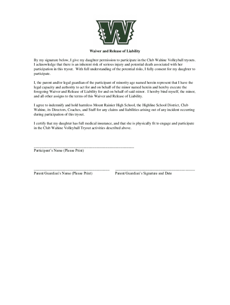 Waiver and Release of Liability By my signature below, I give my daughter permission to participate in the Club Whine Volleyball tryouts. I acknowledge that there is an inherent risk of serious injury