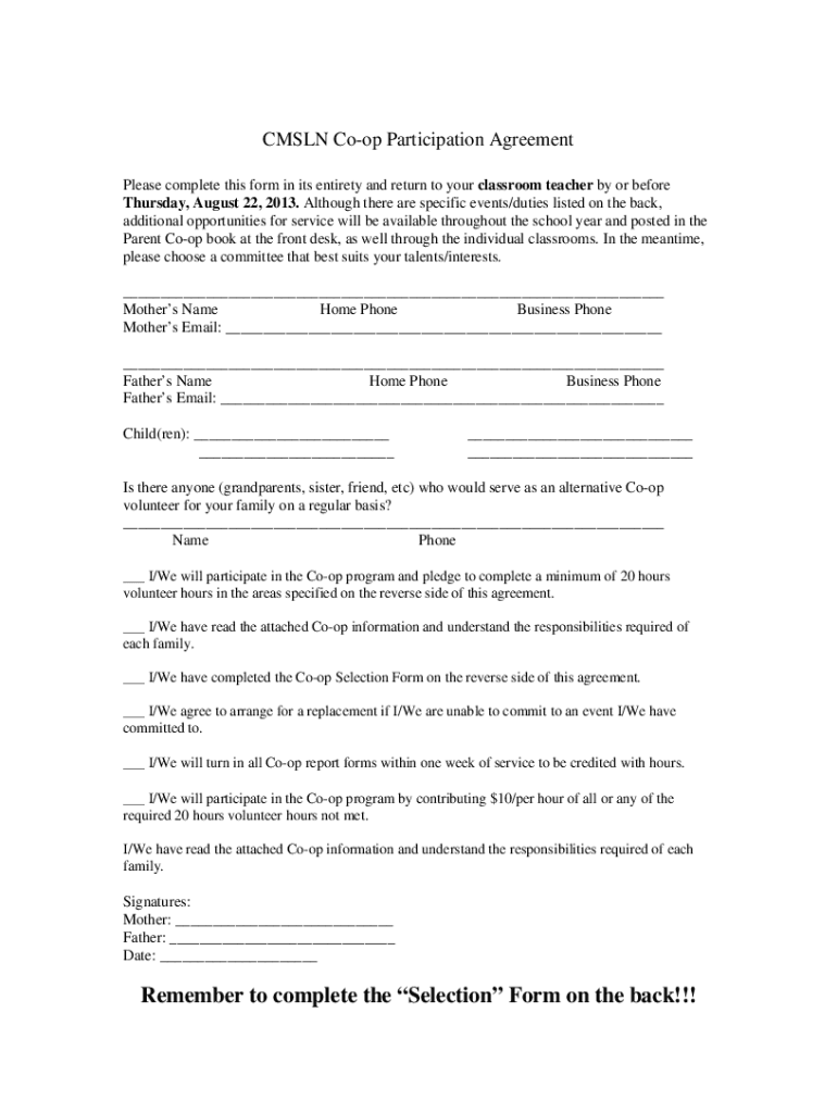 CM SLN Coop Participation Agreement Please complete this form in its entirety and return to your classroom teacher by or before Thursday, August 22, 2013. Although there are specific events/duties