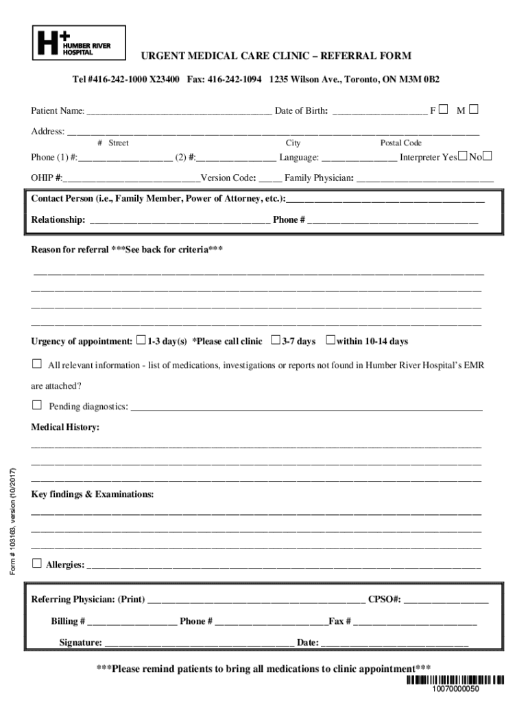 URGENT MEDICAL CARE CLINIC REFERRAL FORM Tel #4162421000 X23400 Fax: 4162421094 1235 Wilson Ave., Toronto, ON M3M 0B2 Patient Name: ___ Date of Birth: ___ F M Address: ___ # StreetCityPostal Telephone